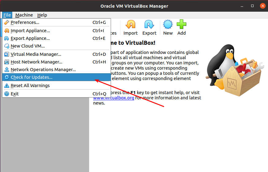 If you want to upgrade current VirtualBox (e.g., version 6.0), go to File → "Check for Updates" on VirtualBox GUI menu. For older versions of VirtualBox, you may find it under Help → "Check for Updates".