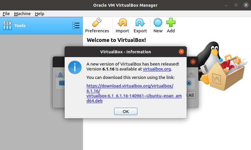 If there is any new version of VirtualBox available (e.g., version 6.1), you will see the following pop-up window. This window can also pop up automatically when launching VirtualBox any time.
