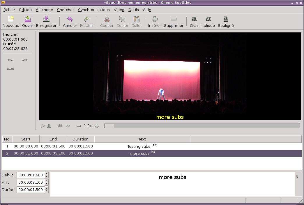 Written in Java, Jubler is a multi-platform subtitle editor. I was actually very impressed by its interface. I definitely see the Java-ish aspect of it, but it remains well conceived and clear. Like Aegisub, you can drag and drop the subtitles on the image, making the experience far more pleasant than just typing. It is also possible to define a style for subtitles, play sound from another track, translate the subtitles, or use the spell checker. However, be careful as you will need MPlayer installed and correctly configured beforehand if you want to use Jubler fully. Oh and I give it a special credit for its easy installation process after downloading the script from the official page.