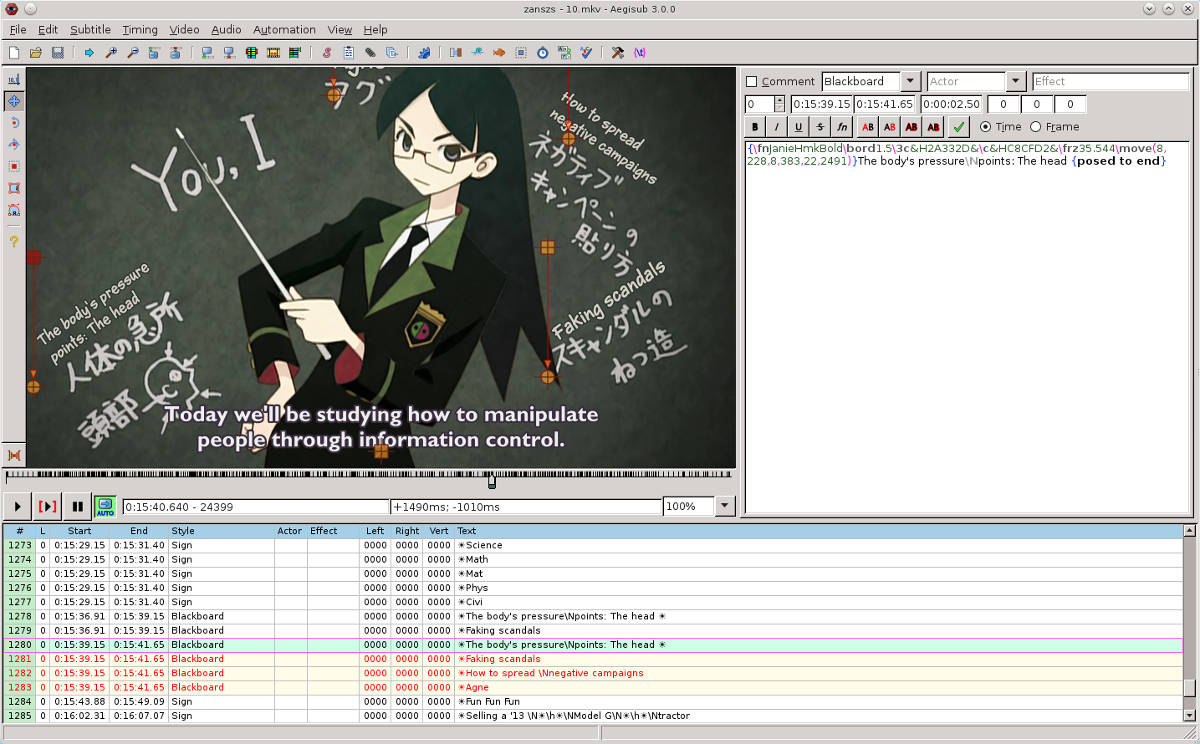 Aegisub is already one level of complexity higher. Just the interface reflects a learning curve. But besides its intimidating aspect, Aegisub is very complete software, providing tools beyond anything I could have imagined before. Like Gnome Subtitles, Aegisub has a WYSIWYG approach, but to a whole new level: it is possible to drag and drop the subtitles on the screen, see the audio spectrum on the side, and do everything with shortcuts. In addition to that, it comes with a Kanji tool, a karaoke mode, and the possibility to import lua script to automate some tasks. I really invite you to go read the manual page before starting using it.