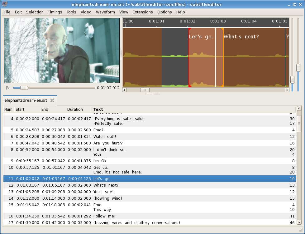 Subtitle Editor is very close to Gaupol. However, the interface is a little bit less intuitive, and the features are slightly more advanced. I appreciate the possibility to define "key frames" and all the given synchronization options. However, maybe more icons and less text would enhance the interface. As a goodie, Subtitle Editor can simulate a "type writer" effect, while I am not sure if it is extremely useful. And last but not least, the possibility to redefine the shortcuts is always handy.