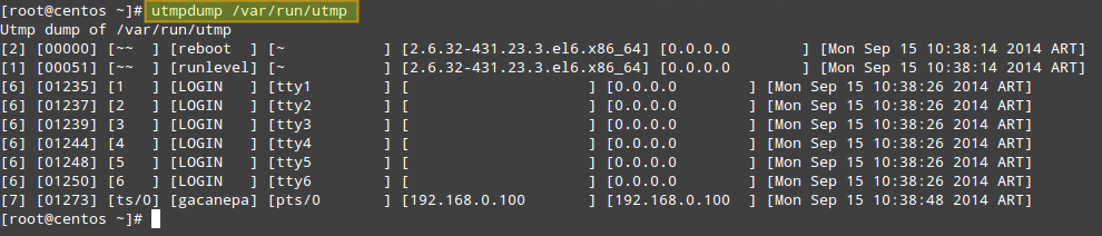 As we mentioned earlier, these log files, as opposed to other logs most of us are familiar with (e.g., /var/log/messages, /var/log/cron, /var/log/maillog), are saved in binary file format, and thus we cannot use pagers such as less or more to view their contents. That is where utmpdump saves the day.