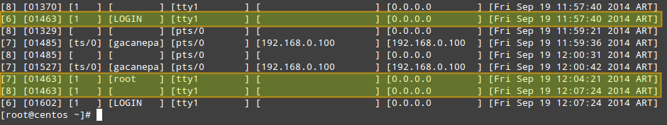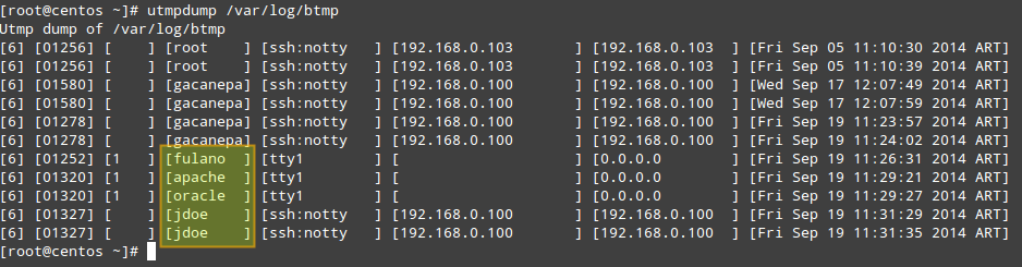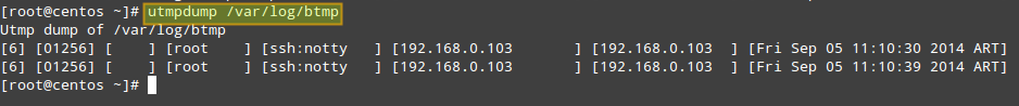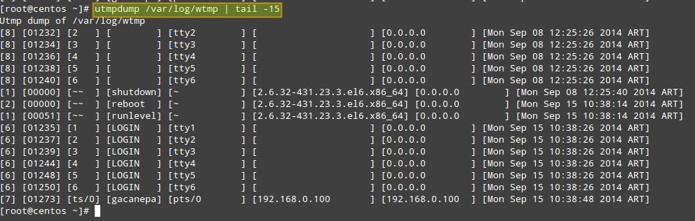 In this post I'll show you how to use utmpdump, a simple program from the sysvinit-tools package that can be used to dump these binary log files in text format for inspection. This tool is available by default on stock CentOS 6 and 7. The information gleaned from utmpdump is more comprehensive than the output of the tools mentioned earlier, and that's what makes it a nice utility for the job. Besides, utmpdump can be used to modify utmp or wtmp, which can be useful if you want to fix any corrupted entries in the binary logs.