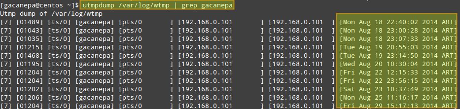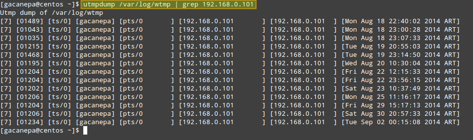 # utmpdump /var/log/wtmp | grep -E "[7].*gacanepa" | awk -v OFS="," 'BEGIN {FS="] "}; {print $2,$4,$7,$8}' | sed -e 's/[//g' -e 's/]//g'