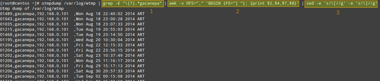As represented with three blocks in the image, the filtering logic is composed of three pipelined steps. The first step is used to look for login events ([7]) triggered by user gacanepa. The second and third steps are used to select desired fields, remove square brackets in the output of utmpdump, and set the output field separator to a comma.