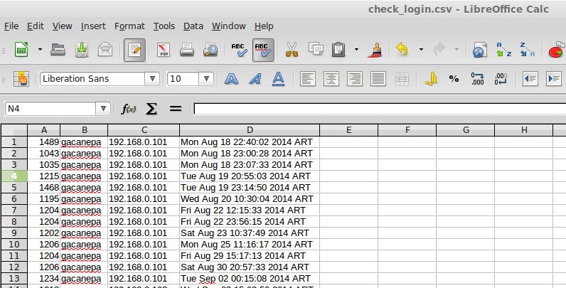 For example, you can use the following command to list all login events of a particular user (e.g., gacanepa) and send the output to a .csv file that can be viewed with a pager or a workbook application, such as LibreOffice's Calc or Microsoft Excel. Let's display PID, username, IP address and timestamp only: