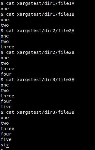 xargstest/dir1/file1A xargstest/dir1/file1B xargstest/dir2/file2A xargstest/dir2/file2B xargstest/dir3/file3A xargstest/dir3/file3B