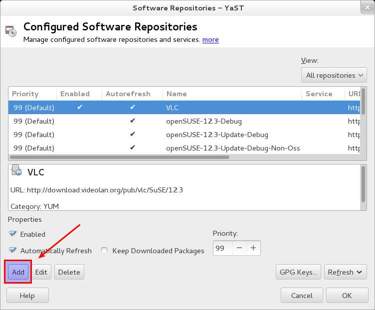 In the next window, you will see a list of configured software repositories. Click on Add button at the bottom.