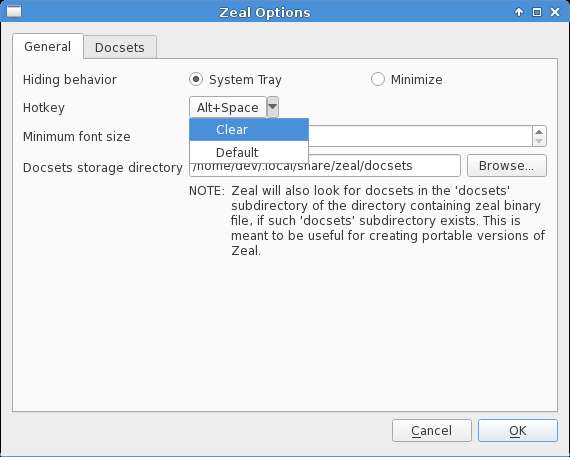 During the first-time launch, you may get a warning message of hotkey binding conflicts. To get around the warning, you can disable the Zeal's default hotkey (i.e., Alt+Space). To do so, go to Edit → Options, and select Clear in Hotkey option. If you want, you can set up a custom shortcut for Zeal.
