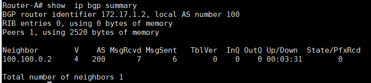 In this example output, the BGP peering is just up between AS 100 and AS 200. Thus no prefixes are being exchanged, and the number in the rightmost column is 0.